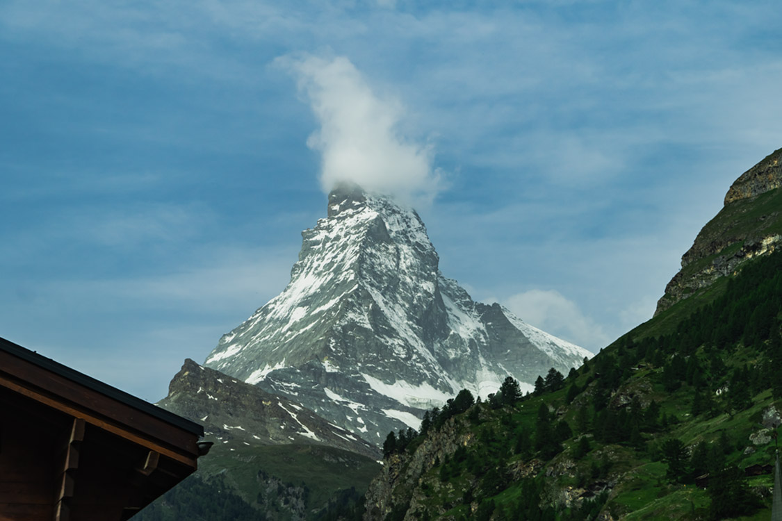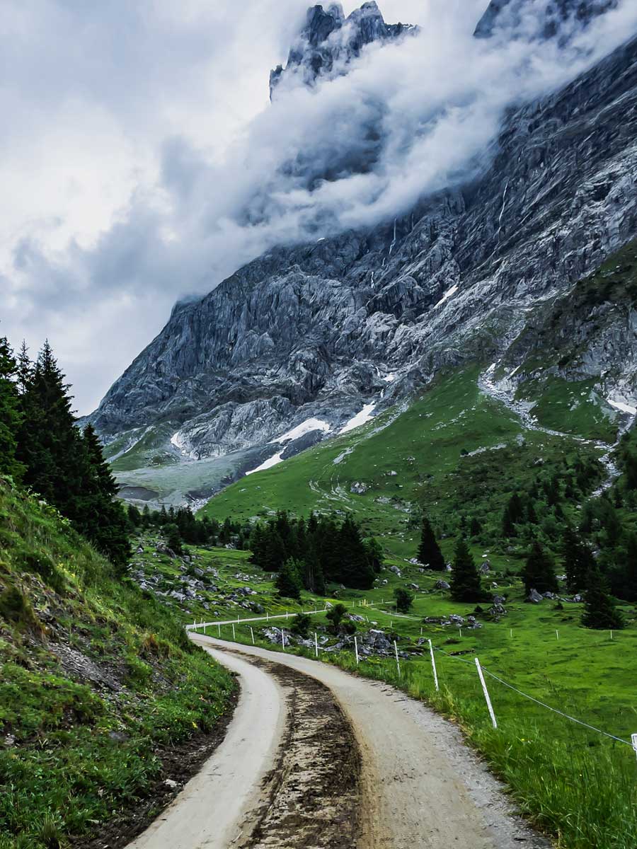 Die Sonne hat sich verzogen, das Gemüt strahlt trotzdem. Heute geht es über den Col de la Croix und den Col du Pillon ins Berner Oberland. Eigentlich ist der Plan noch eine Schleife über Greyerz zu drehen, doch 50 Kilometer mehr und 50 Kilogramm Käserad im Gepäck sind doch zu viel des Guten. Die Beine sind schon ein wenig Schweizer Käse, hart und löchrig. Und ich muss Gas geben, denn der Regen ist mir auf den Fersen. Kurz hinter dem Thunersee in Interlaken hat er mich dann und ich muss mich für 30 Minuten unterstellen. Die Wolken entladen sich komplett, es wird frisch. Die letzten 20 Kilometer hinauf nach Grindelwald bleibt es von oben trocken, die Sonne zeigt sich hier und da und gibt den Blick frei auf Eiger, Jungfrau und Mönch – alle drei fast oder über 4.000 Meter hoch. Beeindruckend und beängstigend zu gleich. Vom Balkon des Hotel Fiescherblick kann ich ein Überbleibsel des Gletschers sehen. Einheimische erzählen mir, dass dieser vor 20 Jahren noch bis kurz vors Dorf gekommen ist, bald aber ist er ganz weg. Schnell weg ist auch das vorzügliche Dinner – wieder einmal. Ach die Schweiz! Wie lieb ich sie hab.